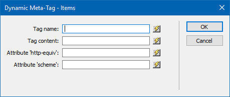 When you click on the Add or Edit button the abowe pop-up open and you can insert your meta-tag info. Each one of this info can be static (you write in this fields the value) or dynamic from a recordset in your page by clicking on the image to the right of each field.